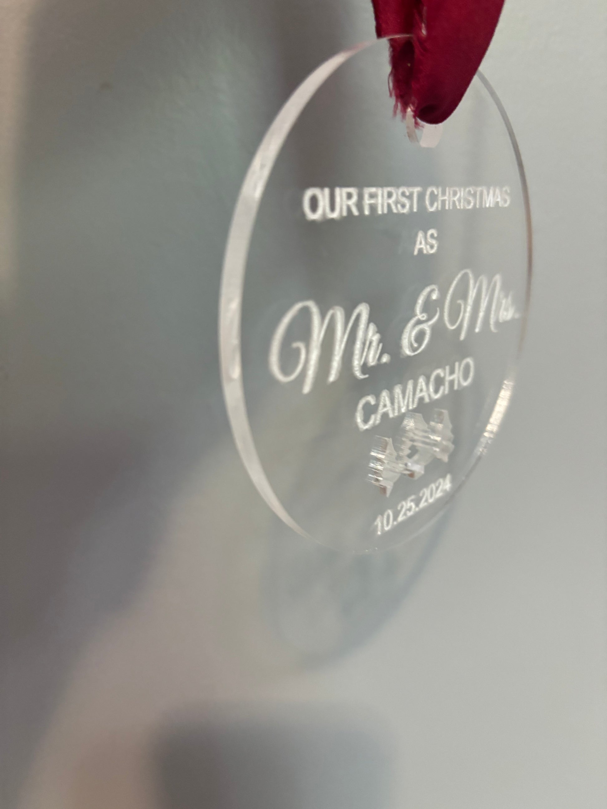 Celebrate your first year of marriage with this personalized Christmas ornament. Made from laser engraved acrylic, it features your names and wedding date for a unique and meaningful addition to your holiday decor. Commemorate your special milestone with this elegant and timeless ornament.