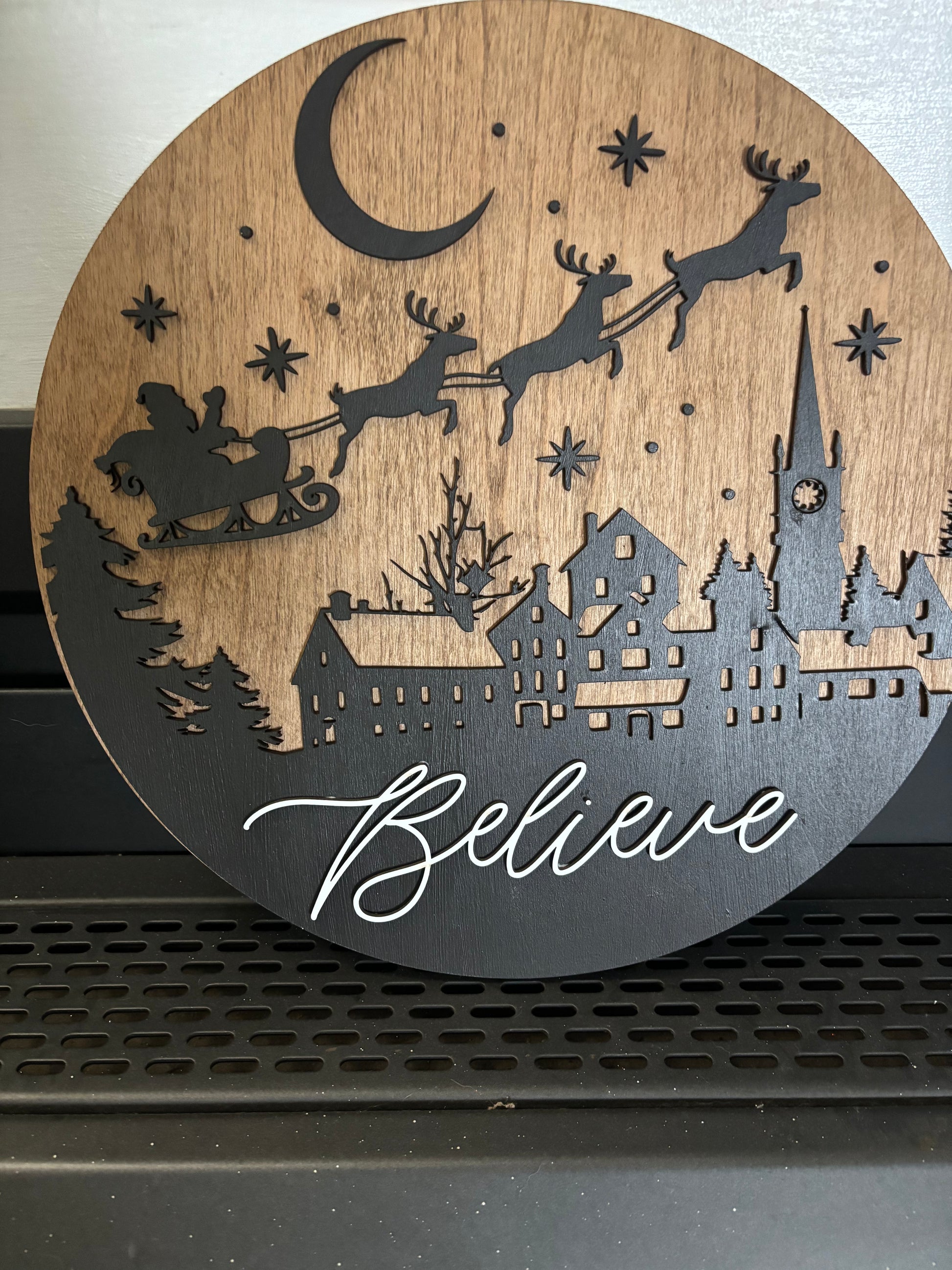 Get into the holiday spirit with our Christmas Sign - Believe Santa's Sleigh. This 15" laser cut birch sign features a hand painted black and stained background with a beautifully detailed Christmas Santa and sleigh flying over a city. Add some festive charm to your home decor this season.