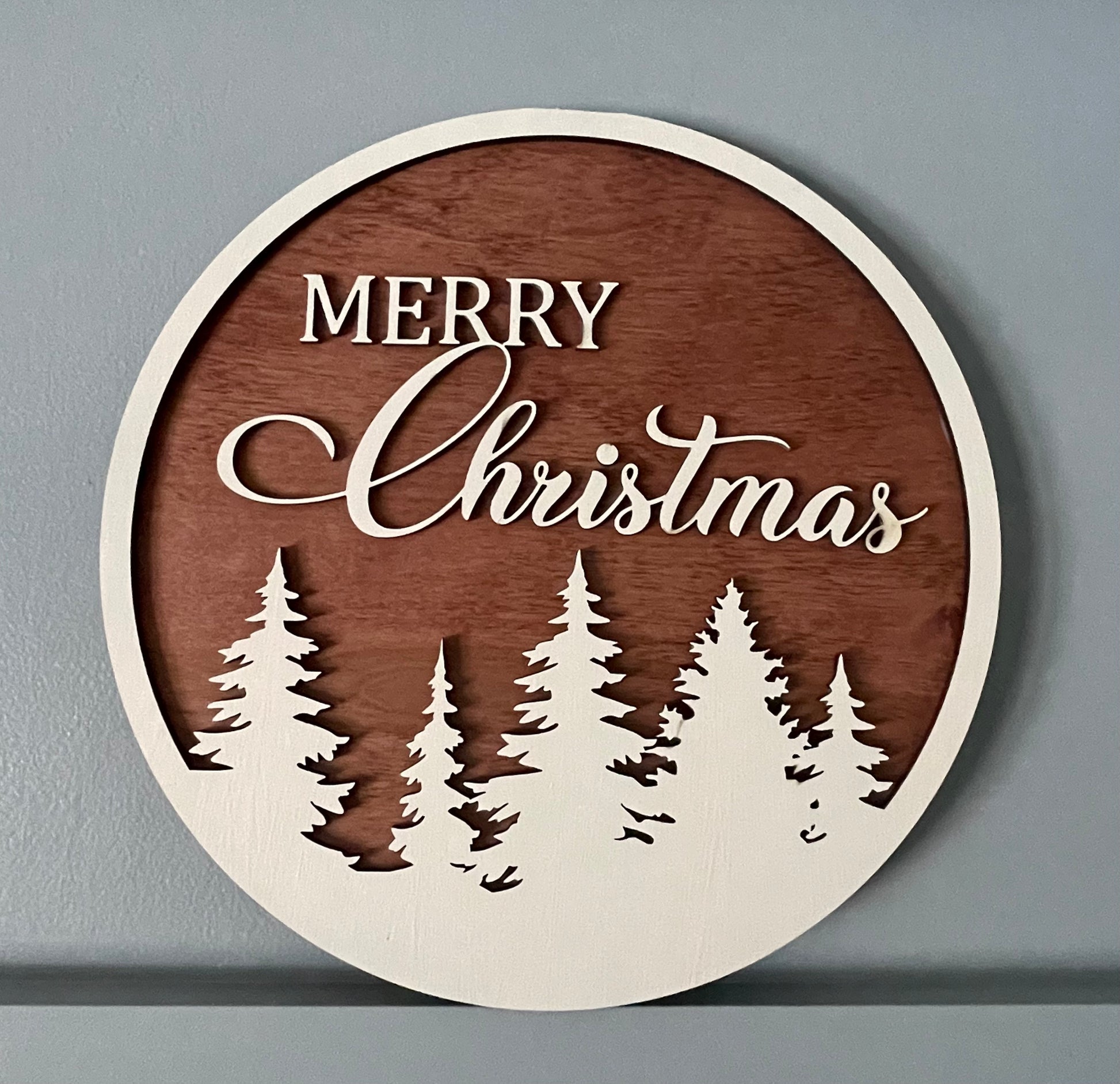 Add a festive touch to your home with our 12" Round Christmas Sign! Beautifully stained background with snowy white pine trees are the perfect decorating accent for your home during the holiday season. Available now at a great price!