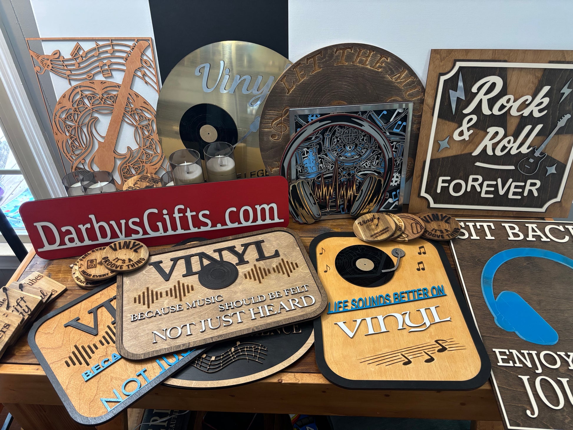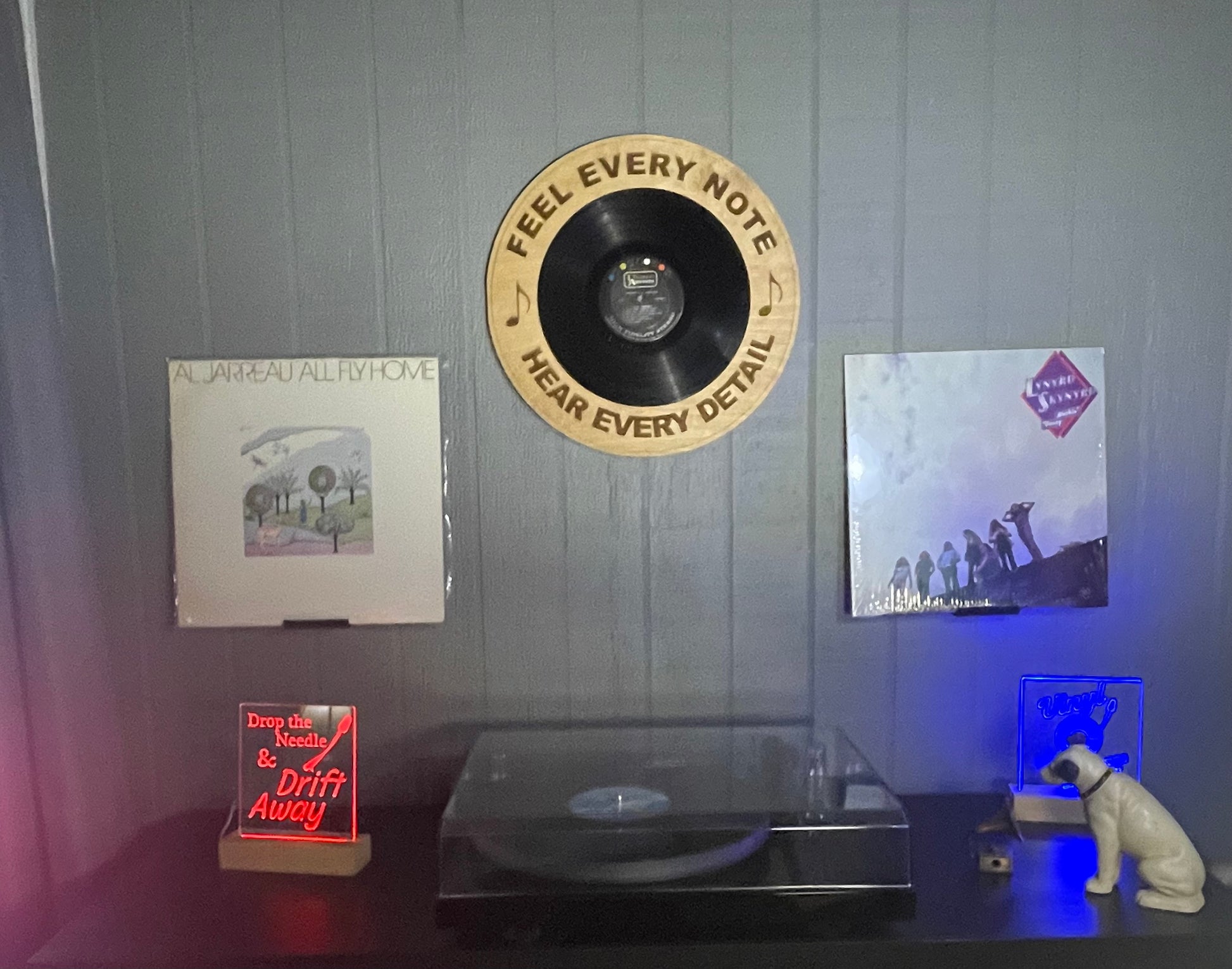 Bring your music room to life with our "Feel Every Note" sign. Handcrafted from layered wood, this sign is perfect for music lovers who want to hear every detail. Add a touch of charm to your space and feel every note with this unique and playful sign! Add your own album to display.