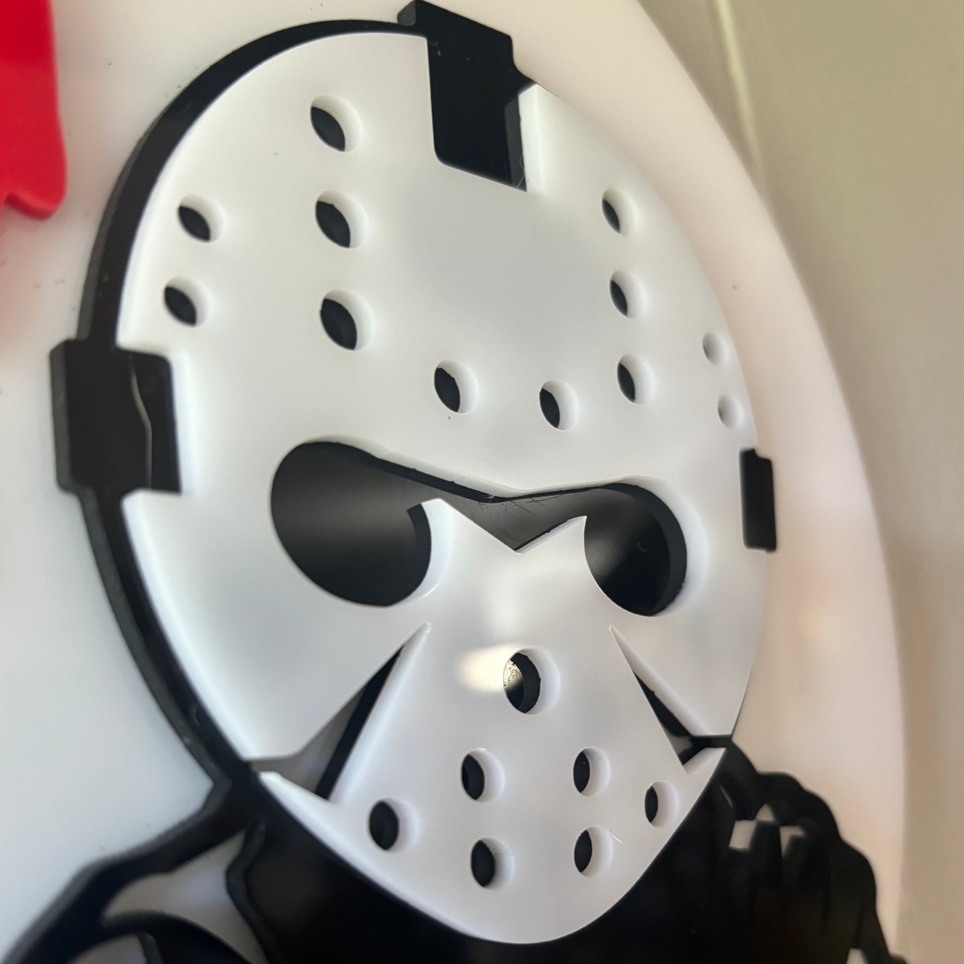 Expertly crafted for Halloween enthusiasts, this acrylic laser cut sign features iconic scary movie characters. At 8", it is the perfect size for wall decorations, adding a spooky touch to any room. Don't miss out on this must-have Halloween accessory.