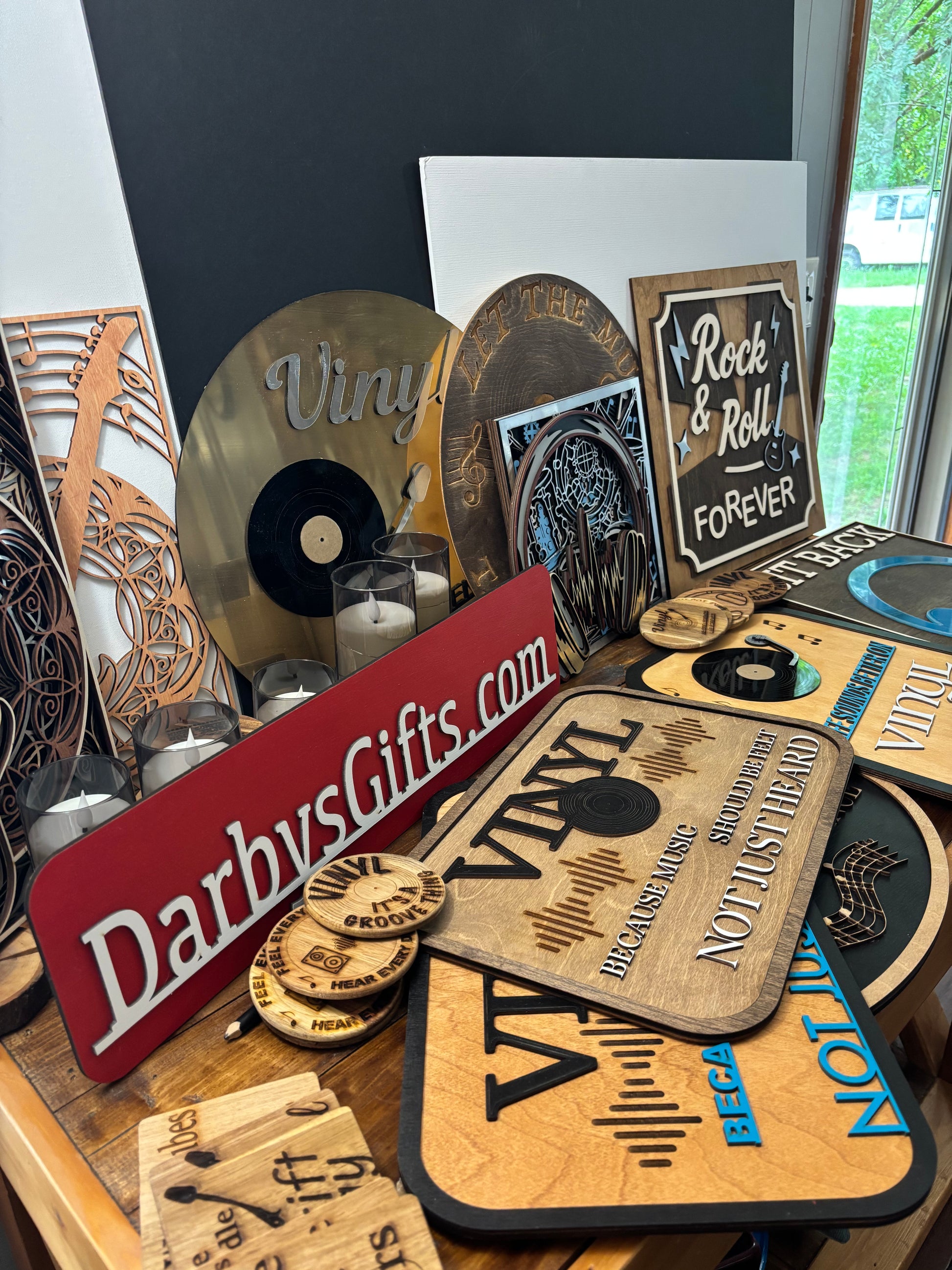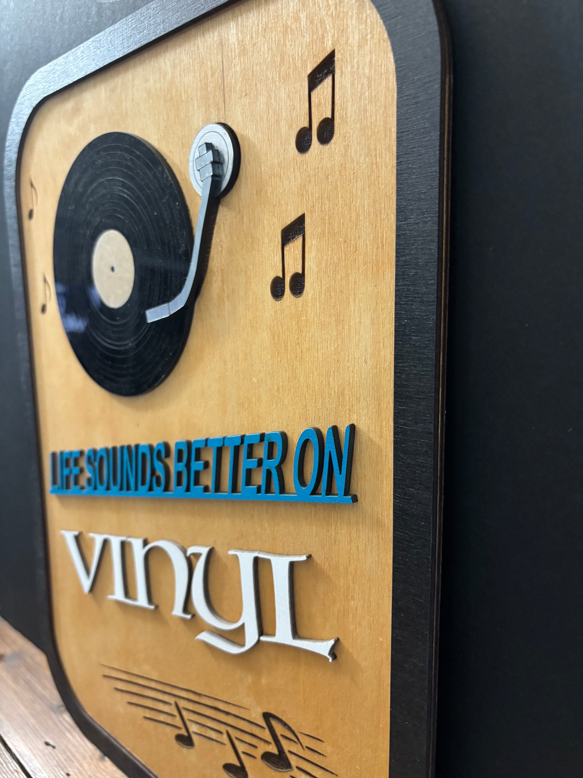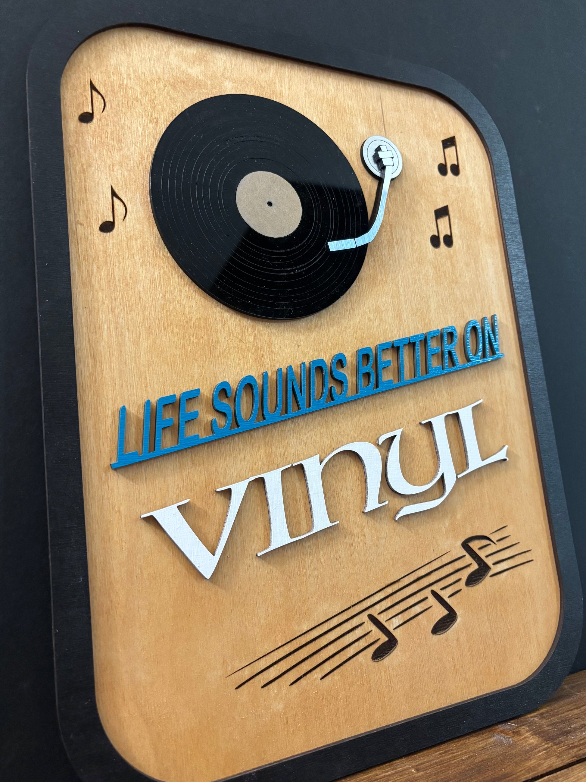 Enhance your vinyl listening experience with this "Life Sounds Better on Vinyl" sign. Made from high-quality wood and acrylic, this laser engraved and cut sign is perfect for any music lover's room or mancave. Embrace your inner audiophile with this stylish and thought-provoking addition.