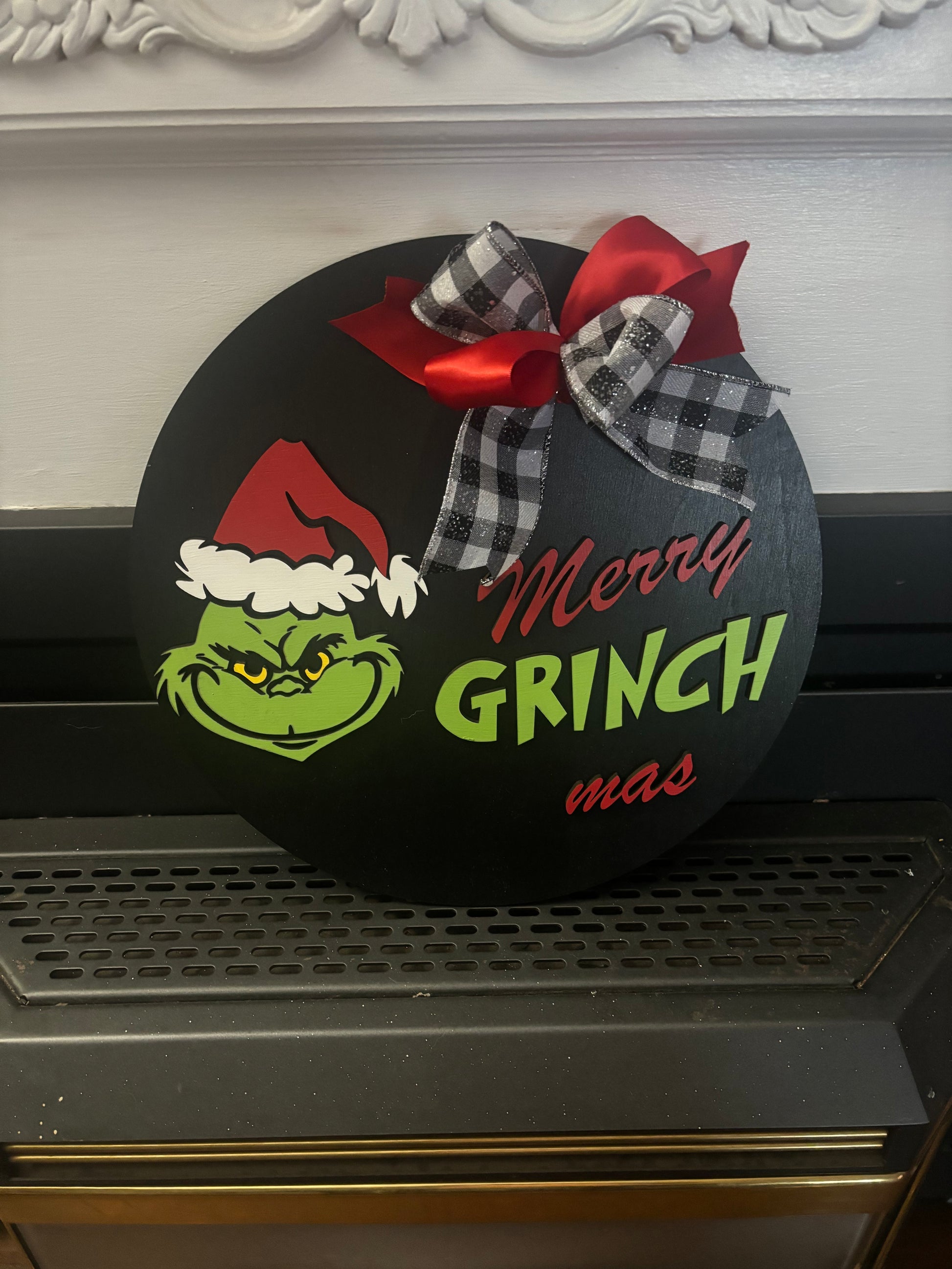 Add a touch of whimsy and holiday cheer to your home with our Merry Grinch Mas Door Hanger Sign. Expertly hand painted and laser cut from birch wood, this 15" round sign can be used as a festive door hanger or wall decor. Spread some Grinchy joy this Christmas season.