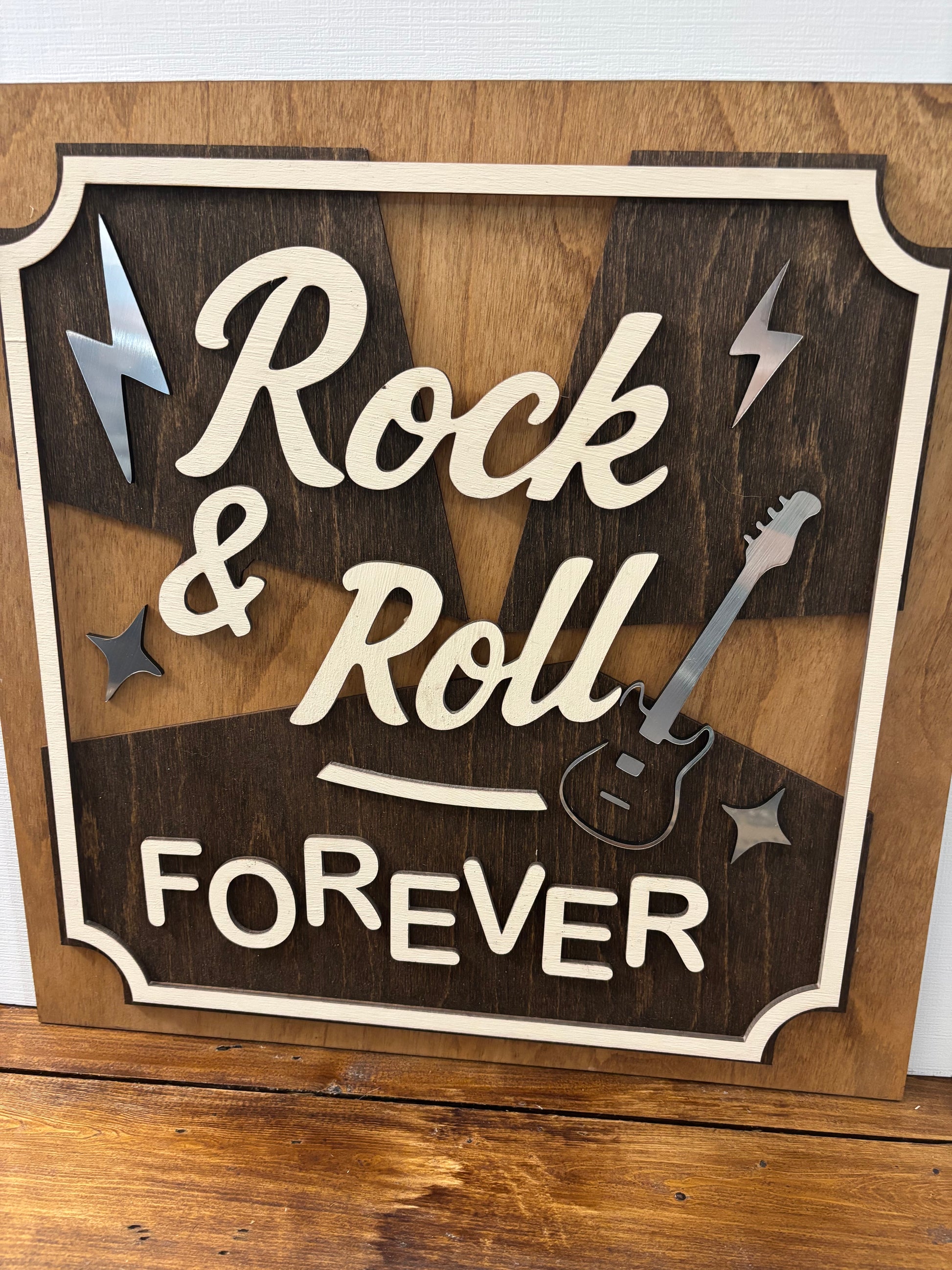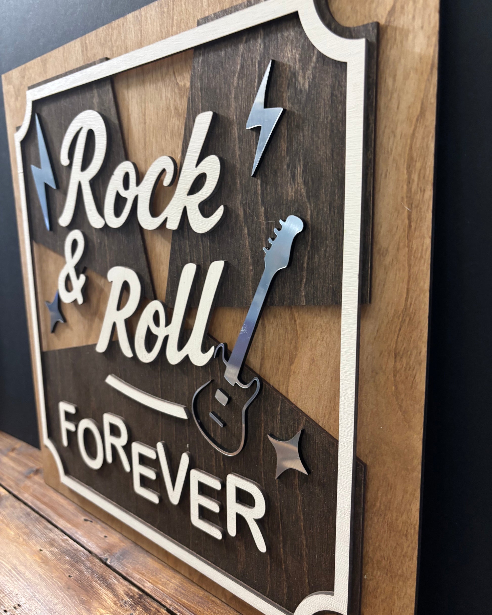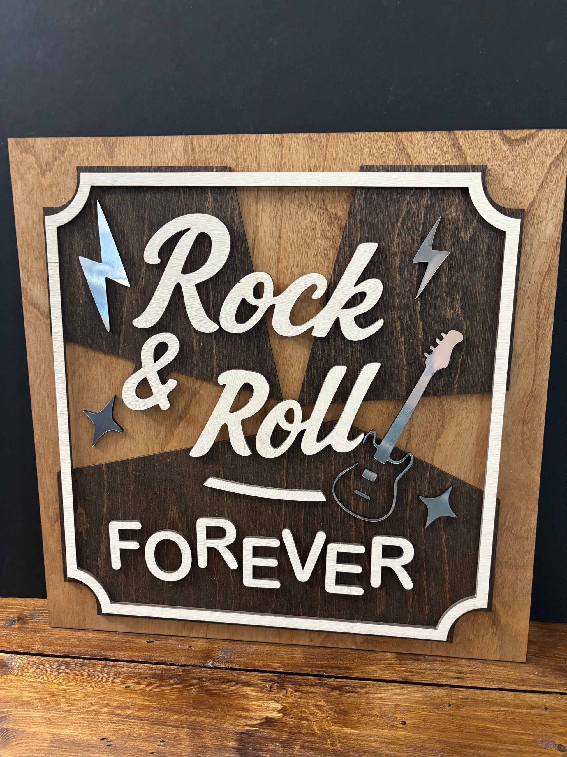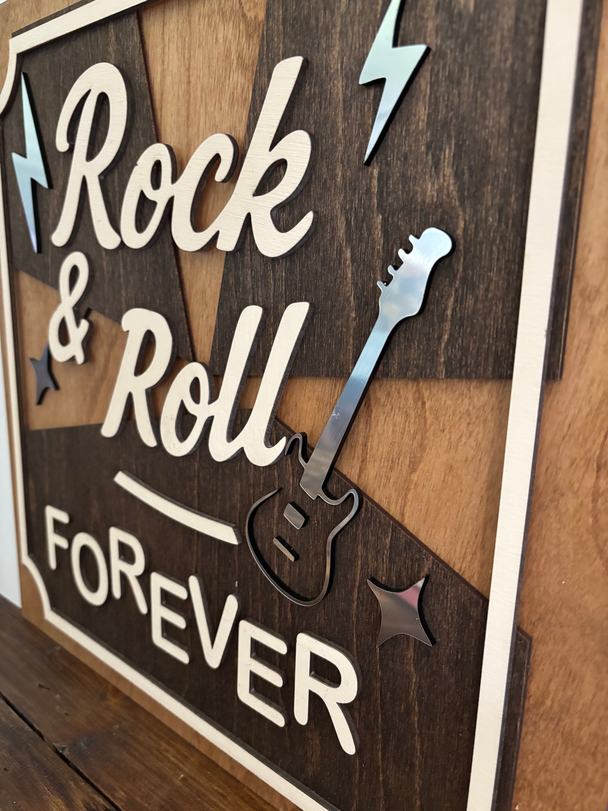 Level up your music room with the "Rock & Roll Forever" Layered Music Sign. Made with 3 layers of wood and acrylic, this handcrafted sign is a perfect gift for any music lover. Show off your passion for music with this bold and inspiring addition to your space.