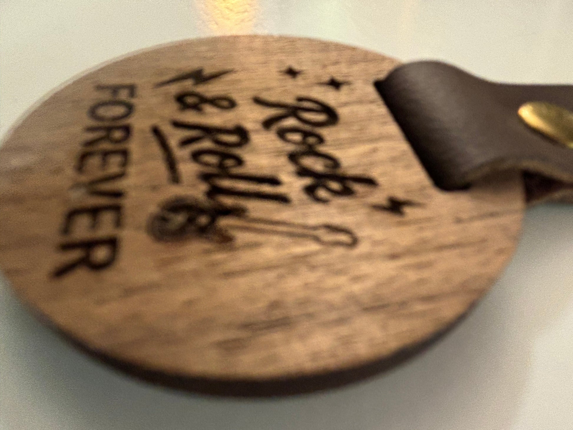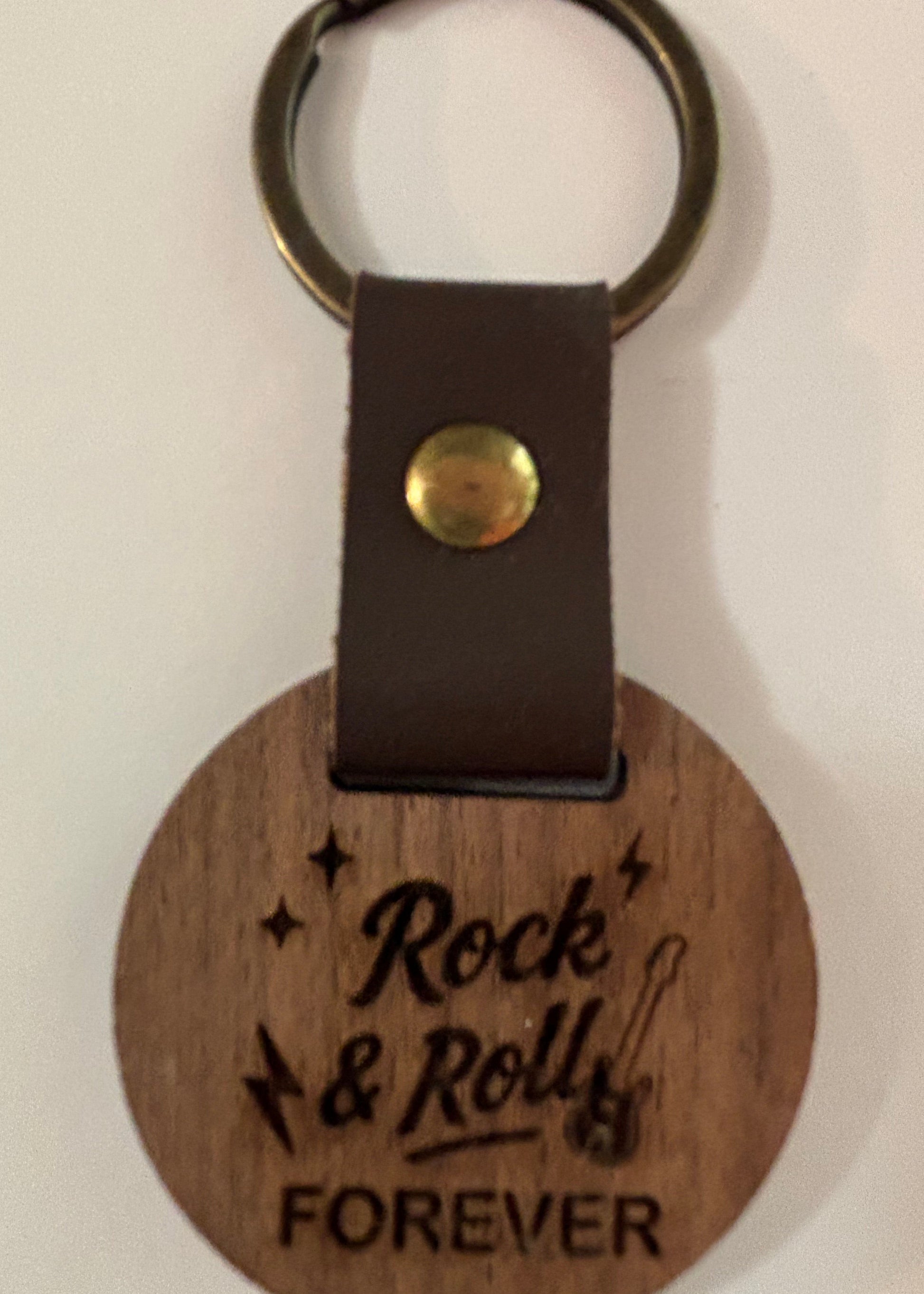 Celebrate your passion for music with this playful "Rock & Roll Forever" wood laser engraved keychain. Its unique design captures the spirit of rock, making it a perfect gift for any music lover. Lightweight and durable, it’s a fun way to keep your keys stylishly in tune wherever you go.