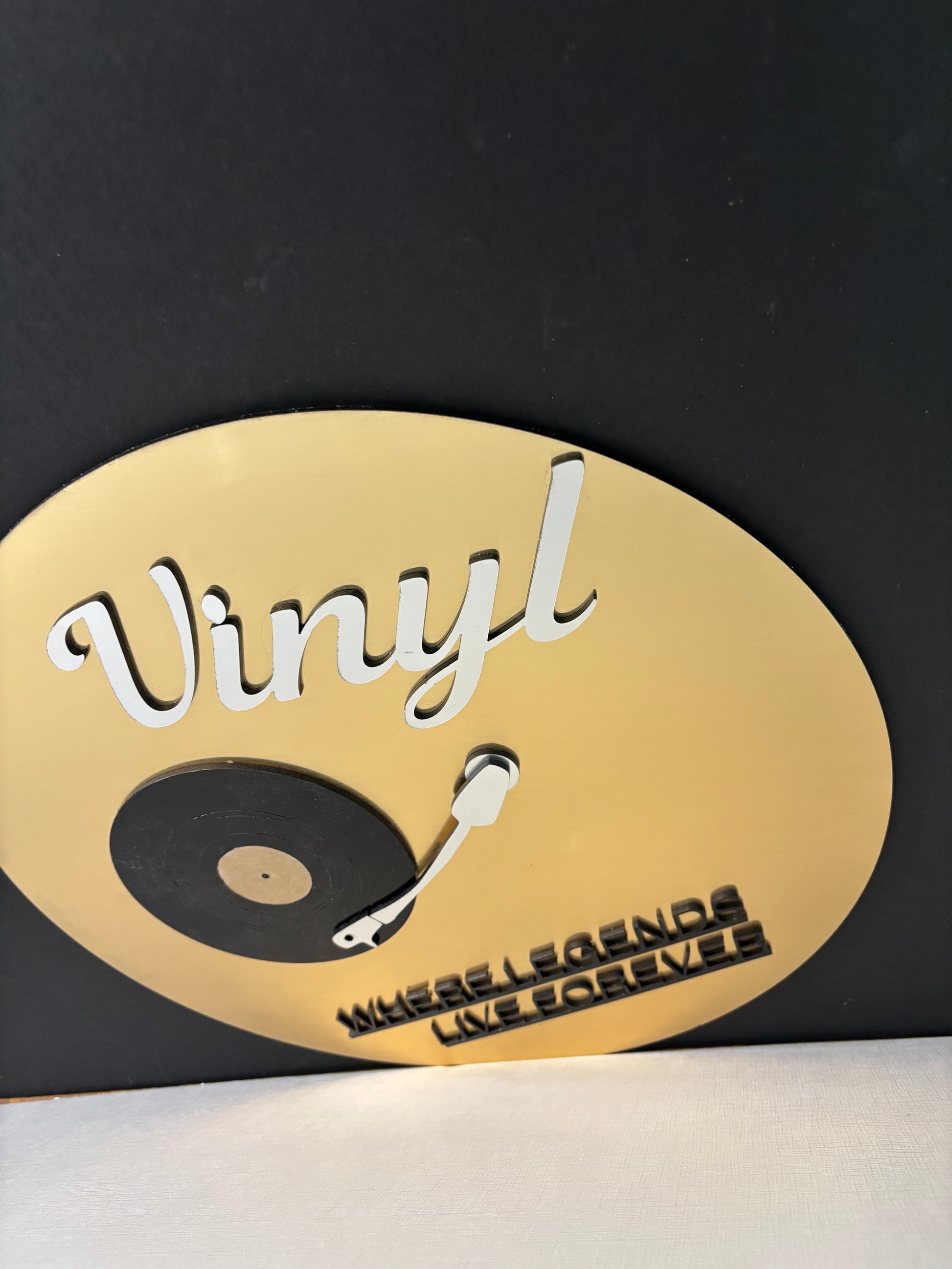 Bring rhythm to your walls with our "Vinyl Where Legends Live Forever" round acrylic sign! This eye-catching piece adds a playful pop to any music room, featuring sleek gold, silver, and black finishes that catch the light like your favorite vinyl spinning. Perfect for music enthusiasts who know legends never die—they just get remixed on your wall! Makes a toe-tapping gift for the audiophile in your life.