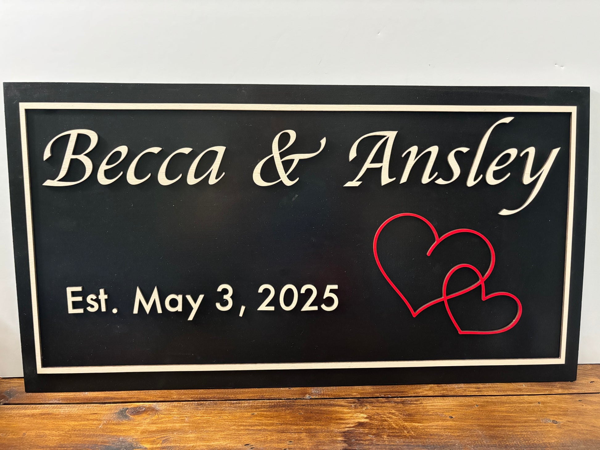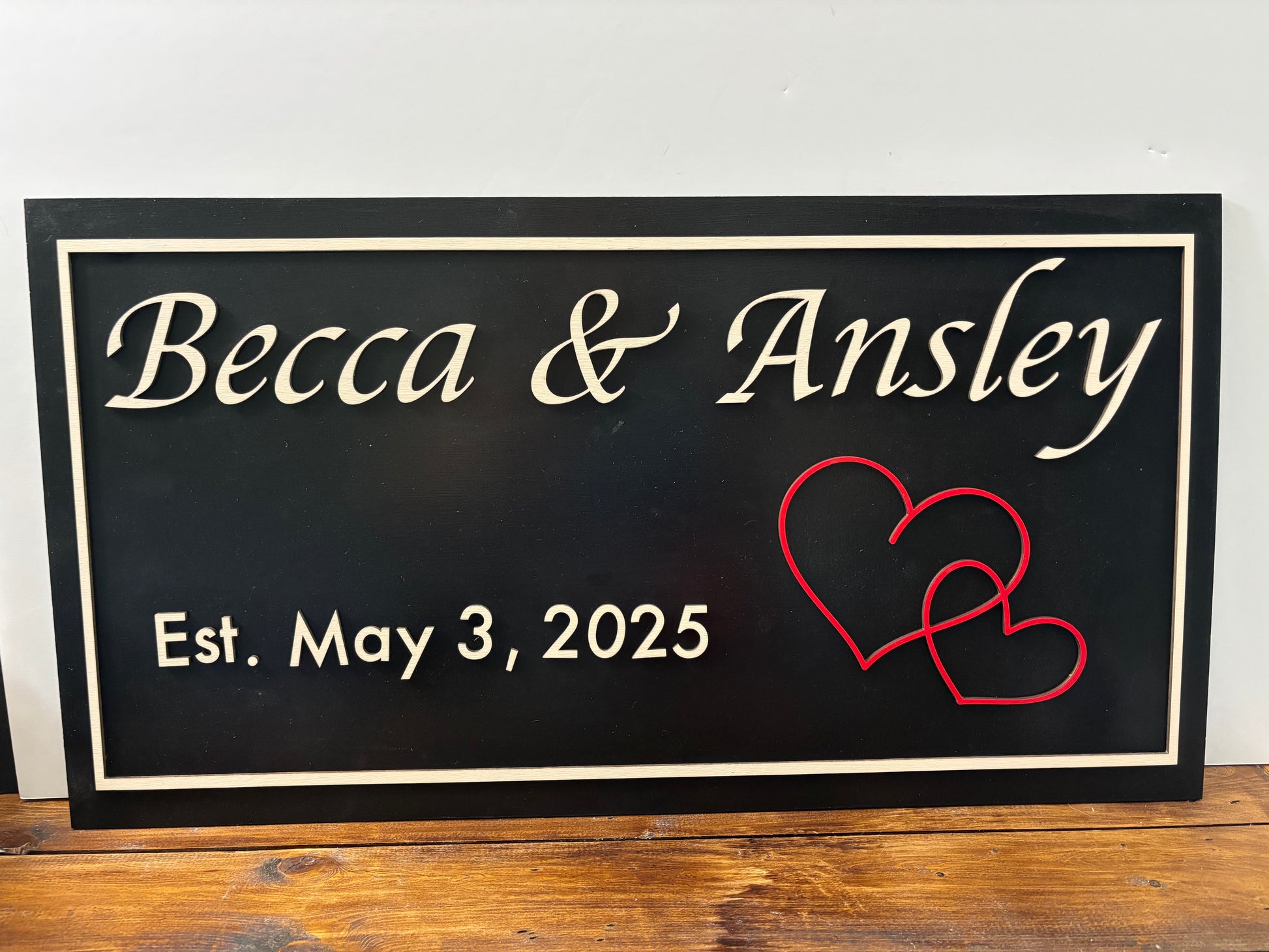 Memorialize your special day with our elegant Wedding Sign. Handcrafted from laser cut wood and hand painted in black and white, this keepsake features your names and established date, sealed with red hearts. A perfect addition to your home decor and a unique wedding gift idea.